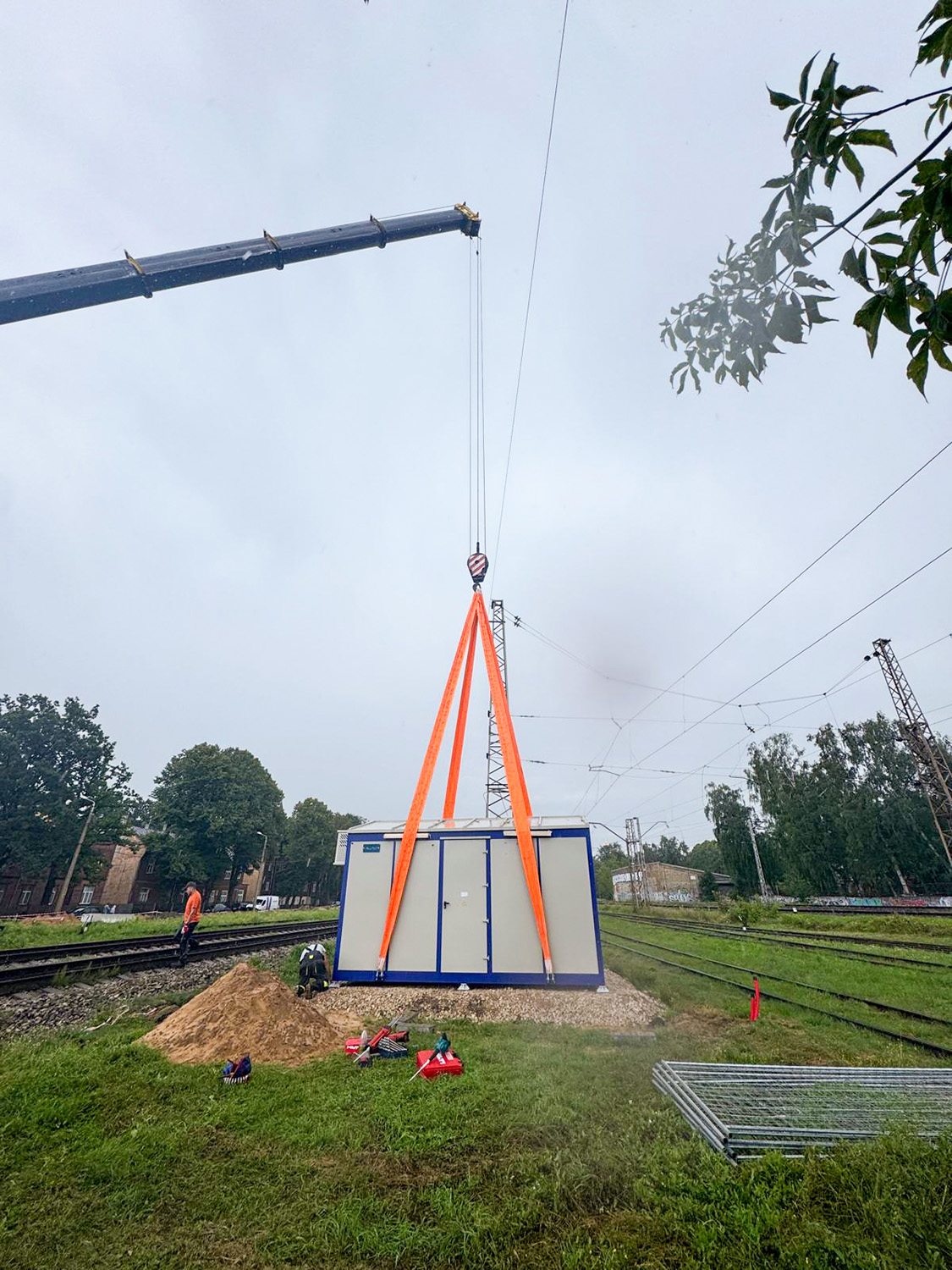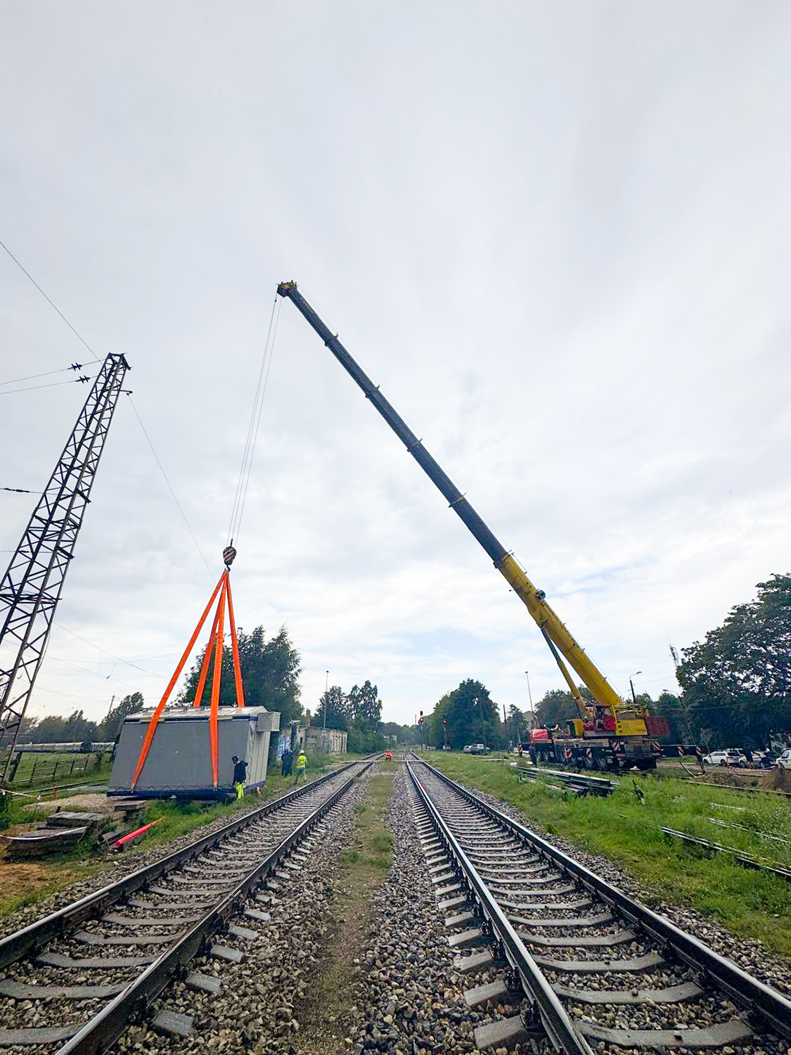 Кілька хвилин роботи потужного автокрана — і пост секціонування займає своє місце на фундаменті, готовий стати одним з ключових елементів енергопостачання контактної мережі.